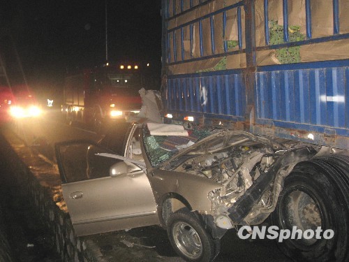 7月29日晚11时许,广西南友高速路一辆小轿车与大货车追尾,小车驾驶员被困变形驾驶室内当场死亡。崇左市消防官兵随后赶到现场破拆小车抬出尸体。中新社发 唐福春 摄