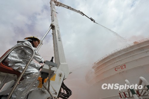 7月30日,浙江舟山,消防队员操作举高喷射消防车对“起火”的储油罐灭火。当日,该市在中化兴中石油转运(舟山)有限公司岙山油库对《危险化学品事故应急救援预案》进行年度演习,消防、医疗、公安、气象、环保、安监等多个部门的数百名专业人员参加。中新社发 琳红 摄