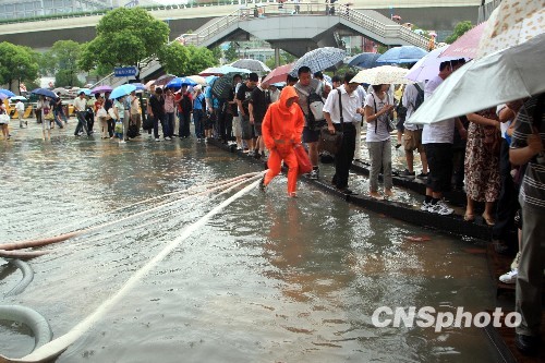7月30日下午,上海拉响暴雨红色预警,市区暴雨如注,令一众市民猝不及防。图为上海莲花路地铁站瞬间积水严重,许多市民在雨中艰难行走。中新社发 潘索菲 摄