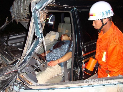 7月31日凌晨,广西南友高速路宁明往南宁方向118公里处,一辆越野车与大货车发生追尾,越野车“全面开花”严重变形,当医护人员和消防官兵赶到时,越野车司机已经死亡。中新社发 何娇 摄