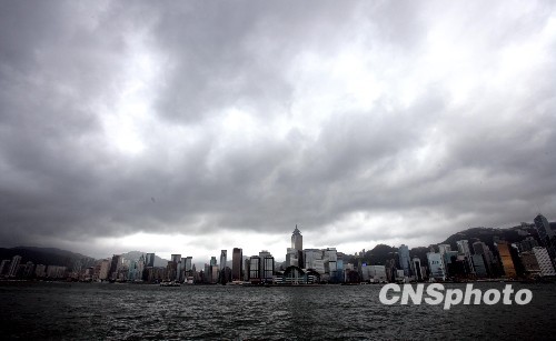 8月4日,香港受热带风暴“天鹅”影响,维港两岸风云变幻。当日,天文台在上午11时15分发出三号强风信号。中新社发 洪少葵 摄
