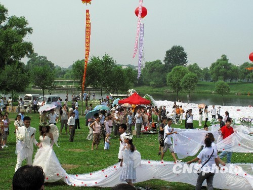 2009年8月6日,29岁的新郎赵鹏与女友在吉林市一公园内举办婚礼,新娘身披新郎特意制作的2162米世界最长婚纱亮相,打破了婚纱1579米的吉尼斯世界纪录。中新社发 朱万昌 摄