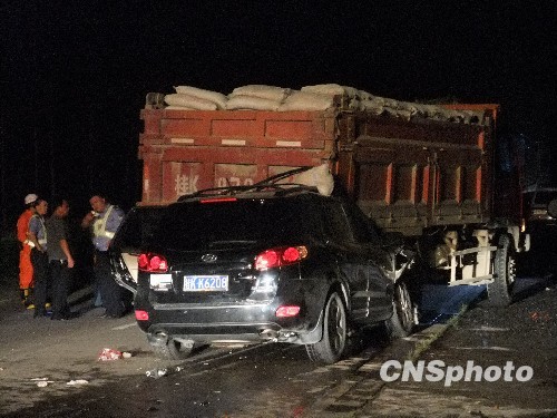 八月八日零点五十分许,广西玉林市境内一辆越野车惨烈追尾一辆大货车,造成越野车内前排三人当场死亡,后排四人受伤被困,其中一名伤者在医院不治身亡。被困者随后被赶来的玉林特勤消防大队官兵撬开车门救出。中新社发 刘家鑫 摄
