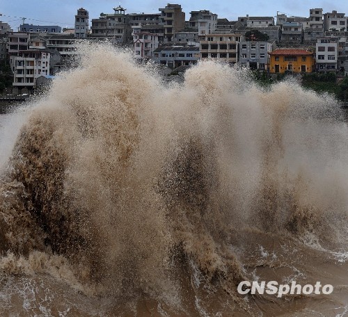 8月8日,浙江玉环沿海激起狂风巨浪。 受到台风“莫拉克”影响,当日中午11时正逢涨潮,该县坎门应东码头大浪汹涌而起,直扑防浪堤,激起巨浪高约20多米。中新社发 林楚炳 摄