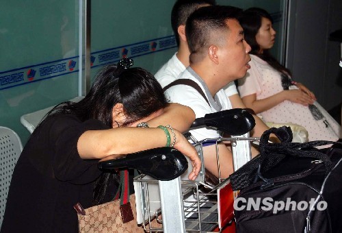 8月8日,是福州至台北新增航班首飞的日子,准备乘坐福州至台北首次增航的旅客正在福州长乐国际机场等候航班消息。受台风“莫拉克”影响,该航班当天被迫取消。中新社发 龙景定 摄