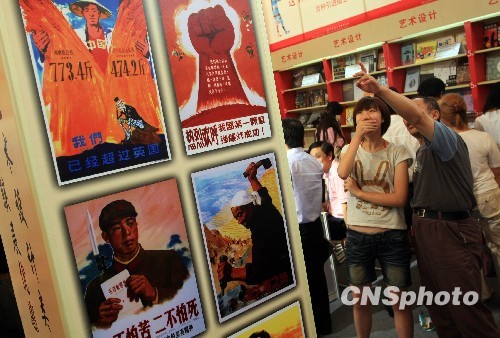 8月14日,一组新中国“红色经典”宣传画亮相上海书展,吸引了众多读者的目光。图为一位父亲正在给女儿讲述“红色”往事。中新社发 汤彦俊 摄