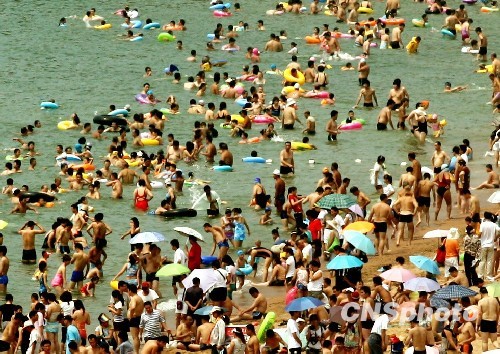 8月16日,青岛一些市民、游人在汇泉湾海滩休闲乘凉,度过“秋老虎”。据悉,8月中旬青岛气温持续在30摄氏度左右,海水平均温度在25摄氏度左右,适宜人们下水活动。中新社发 宋吉河 摄
