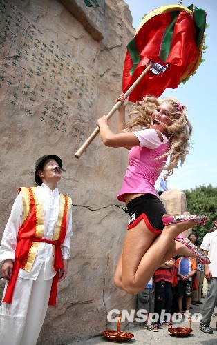 8月17日,在河南信阳南湾湖茶岛上,一名国际旅游小姐随着当地传统的鼓声纵身跳起采茶舞。当日,来自100多个国家和地区的120位佳丽巡游河南信阳。中新社发 王中举 摄