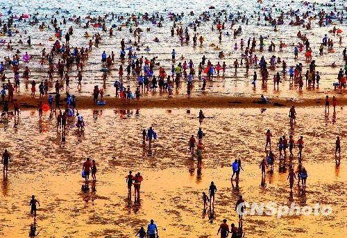 8月中、下旬恰是青岛国际啤酒节期间,来青岛休闲度假的游客大增。近日,青岛海水平均温度在25摄氏度左右,适宜人们下水活动,海滩浴场天天出现万人赶海的盛况。中新社发 宋吉河 摄