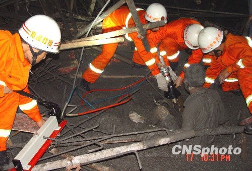 8月17日晚,重庆市铜梁县金江水泥厂发生一起脚手架垮塌事故。截止18日9时40分,该事故已造成5名施工工人死亡,2人失踪,7人受伤。图为消防官兵正在用液压钳和液压剪对被困泥浆中的人员进行救援。中新社发 谭鹏程 摄