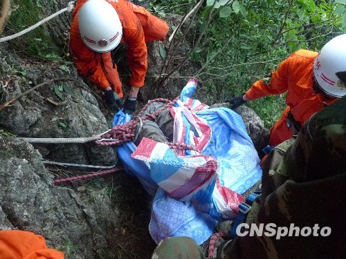 8月18日晨,广西柳州市柳城县古砦乡,一名吴姓青年爬上大横山上寻宝时,不慎掉入天坑中。柳城消防官兵接警后迅速赶往现场利用器材爬下天坑,经过12个小时的救援,该青年尸体被抬上天坑。中新社发 廖承果 摄