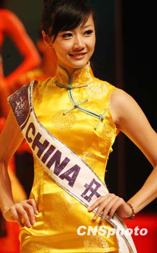 8月19日,正在河南参加2009国际旅游小姐冠军总决赛的120个国家的佳丽来到漯河巡游展示。图为中国参赛佳丽沈玉洁展示旗袍风采。中新社发 钱兴强 摄