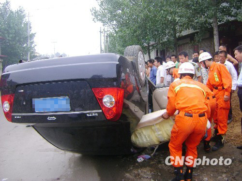 8月20日,山东邹城市公安消防大队接报:位于峄化集团门前路段,一辆轿车倒翻于马路中,一男子被困车内。接警后,中队立即出动抢险救援消防车及6名消防官兵。在事故现场,一辆黑色小轿车倒翻在路边,被困男子在车里不断发出呻吟声。由于被困男子所处位置比较复杂,为保证救援万无一失,消防官兵借助起重气垫、扩张器和手动开门器等工具扩展空间。经过努力,被困男子成功获救。被守候一旁的120医护人员送往医院。据知情者介绍,该辆小轿车由于车速过快躲避行人不当而倒翻。中新社发 张鹏 摄