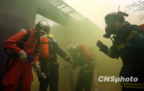 八月中旬,北京宣武区消防部门在繁华的商业街区大栅栏进行消防演练。中新社发 汤亮 摄