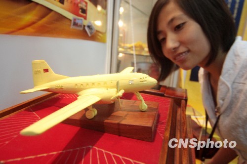 8月21日,毛泽东黄金专机模型亮相北京国际礼品博览会,吸引参观者驻足欣赏。为了纪念新中国成立60周年,根据共和国领袖毛泽东专机以1:100比例原貌制造,机身长21㎝、宽31㎝、高7.79㎝。毛泽东黄金专机模型经过千足金和纯银熔铸,并在驾驶舱两侧叶窗镶嵌水晶钻石2颗,机罩、机托采用上等的花梨木激光雕刻编号、花纹。整款藏品经国内高级工艺师精雕细琢成。中新社发 吴芒子 摄