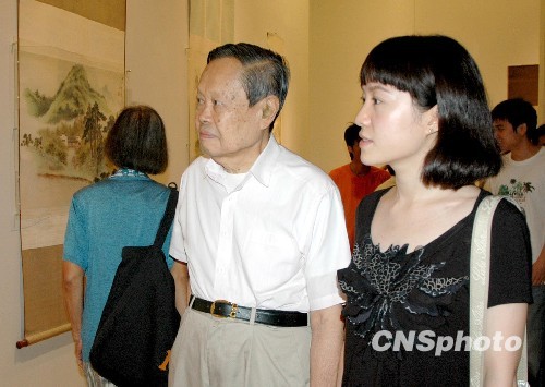 8月22日,由中华人民共和国文化部主办、中国美术馆承办的“向祖国汇报——新中国美术60年”大展向公众免费开放,杨振宁携夫人翁帆与市民一同观看展览。中新社发 李文明 摄
