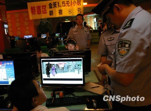 8月22日凌晨,北京海淀警方出动200余名警力,对辖区网吧进行安全检查。整个行动中,警方共检查网吧136家,重点检查了网吧对上网人员依法登记、内部安全防范措施落实等情况。行动中,警方还对2名上网可疑人员依法进行了传唤审查。中新社发 胡蓉 摄