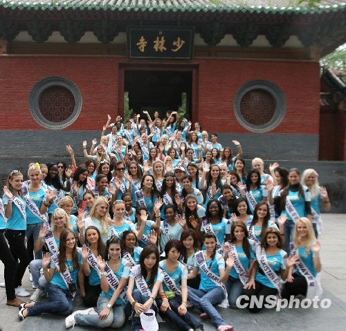 8月23日,2009国际旅游小姐在河南登封少林寺山门前合影留念。当日,来自120个国家和地区的120位2009国际旅游小姐河南造访少林寺。中新社发 王中举 摄