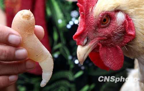 河南商丘市睢阳区冯桥乡一村民养的一只老母鸡,近日下了一个形似海豚、有眼有脸、还带着一条小尾巴的怪蛋。中新社发 侯伟胜 摄