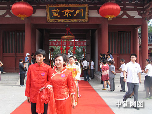 八月二十六日,陕西西安首届华清池七夕中华情人节上,近百对有情人身着唐服,举行唐代宫廷婚礼,由“唐明皇”和“杨贵妃”见证爱情。图为新人们步入望京门。作者 冽玮
