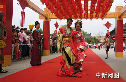 八月二十六日,陕西西安首届华清池七夕中华情人节上,近百对有情人身着唐服,举行唐代宫廷婚礼,由“唐明皇”和“杨贵妃”见证爱情。图为新人跨过寓意“平安”的马鞍。冽玮 摄