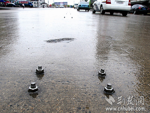 武昌白沙洲大道武泰闸武商量贩店门前约200米路面上,路中和路的一侧布满大量金属螺钉,每4个组成一个小矩阵,总数至少有上千个。路边商户称,该路段曾围起挡板施工,一周前挡板拆除,固定挡板的螺钉便留在了路上,经常有车辆被戳破轮胎,安全隐患很大。