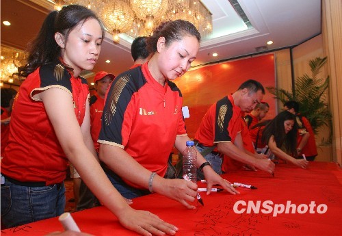 8月31日,参加“革命圣地大穿越,献礼六十年国庆”的大型主题公益自驾游活动的20余名自驾车友抵达活动目的地之一的湖南长沙。他们将在为期16天的时间内跋涉6000余公里,穿越中国数十个“革命圣地”与“红色旅游景区”,足迹遍及广东、江西、福建、湖南等19省区,以此表达对革命先烈的缅怀和新中国成立60周年的祝福。图为车手们在湖南站启动仪式现场献礼国庆60年“万人大签名”的互动环节中,拿起画笔为新中国60岁生日留下祝福。中新社发 傅煜 摄