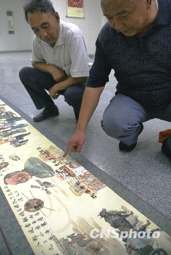 为纪念新中国60岁生日,河北省美术馆展出“田园心歌——河北省农民画精品”。画展由广大农民画艺术家们用农民画的艺术形式,描绘了新中国成立60年来农村的巨大变化。此次展出的137幅作品,是从全省各市、县农民画家创作的200多幅作品中遴选出来。图为9月2日,在河北省美术馆两位老人正在欣赏“冀中平原60年农村巨变”长篇油画。中新社发 翟羽佳 摄