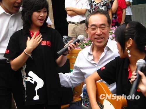 9月2日上午,在四川视察援建项目进度的香港政务司司长唐英年,在四川省人民医院地震伤员康复中心看望地震伤员。图为唐英年受到动人歌声的感染,与几位腿部受伤的少女共唱《小城故事》。中新社发 蓝婧 摄