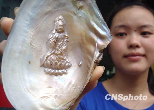 9月2日,一名女士展示长有“观音菩萨”造型的蚌壳。近日,苏州山塘街一家珍珠商店内上柜销售的长有“观音菩萨”造型的蚌壳,吸引了引起了许多游客的目光。据悉,这种采用“人工技术”使蚌壳长出的“观音菩萨”,栩栩如生,十分逼真。中新社发 王建康 摄