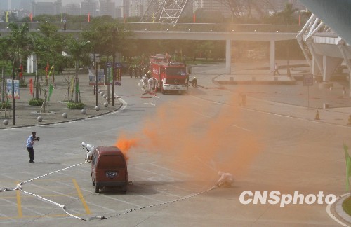 9月3日,由广东省公安厅统一部署的大型反恐演习在在佛山举行,广东省反恐办公室、佛山市反恐成员单位以及多家媒体记者等观摩了演练。一起“由专业恐怖分子制造的爆炸化学恐怖袭击事件”经佛山警方30分钟紧急处置,3名“恐怖分子”被击毙,爆炸现场毒气全部消除,“受伤人员”得到及时的抢救和医治。中新社发 孙建驹 摄