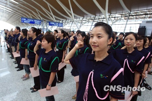 9月4日,上海机场成立世博志愿者服务总队,120名志愿者庄严宣誓:不计报酬,帮助他人,服务社会。据统计,2010年上海世博会举办期间,将有7000万人次的参观者,其中有一半左右将乘坐飞机抵离上海。如此大的客流增量,对上海机场的服务保障工作将是一次严峻考验。中新社发 潘索菲 摄