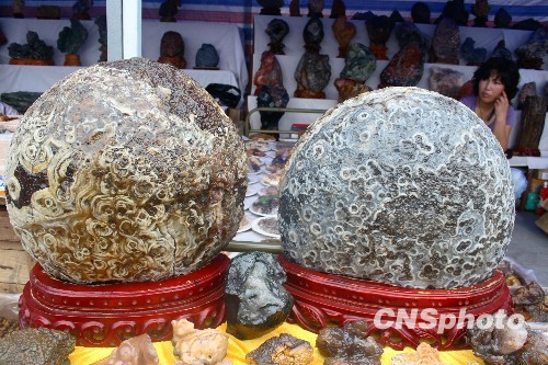 2009年9月5日,山东济南市民在奇石文化艺术收藏品展览会上观赏奇石,来自新疆、广西、福建、安徽及缅甸等国内外的奇石收藏者会聚济南办展,其中展示了许多石中珍品。中新社发 俄国庆 摄