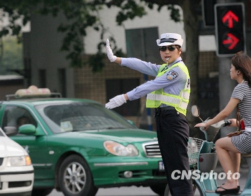 9月6日,一位女交警在南京街头指挥交通。近日,南京市成立了两支女子交警中队,为古城南京增添了一道亮丽的风景。据了解,这是自1958年后南京街头再度出现女交警。中新社发 文宝 摄