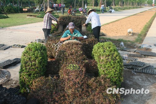 9月6日,工人在台州市民广场赶制F1赛车迎国庆景观。当日,一辆由麻袋、土包、绿色植物制作的绿色环保F1赛车景观亮相台州市民广场,为国庆60周年营造节日气氛。中新社发 王天荣 摄