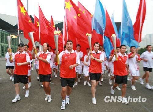 9月7日,奥运冠军贾占波、孙甜甜、飞碟运动员世界冠军张冰、武术运动员世界冠军张帅可、现代五项全运会冠军修秀共同领跑第十一届运动会河南火炬传递起跑仪式。当日,由国家体育总局和第十一届全运会组委会主办主题为“祝福祖国,共享全运,国泰民安,传递和谐”的中华人民共和国第十一届运动会河南火炬传递活动在郑州拉开序幕。中新社发 王中举 摄
