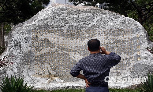 9月9日,中国国家图书馆即将迎来百岁生日。日前,一块刻有《百年国图赋》重达40吨的泰山石吸引不少路人的目光。《百年国图赋》由国家图书馆馆长詹福瑞创作,并由雕刻家将其雕刻在泰山石上,它记录了一个世纪以来国家图书馆发展历程的总结与概括,并细述了国家图书馆馆藏类型、面向各个层次的各种服务等。中新社发 郑雄增 摄