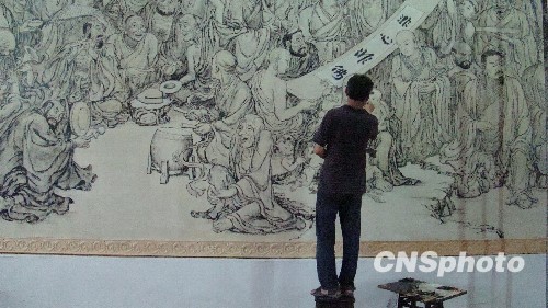 9月,正在四川什邡市举办的纪念马祖诞辰一千三百周年暨第二届马祖文化节上,由澳门知名画家苏法融创作的《108罗汉图》亮相马祖罗汉寺。《108罗汉图》壁画由两个整块的油画画布构成,每个画布长8.1米,宽4.2米。中新社发 陈运涛 摄