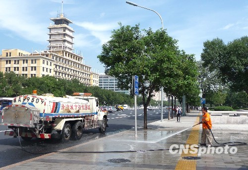 2009年9月9日,环卫工人在北京西长安街复兴门清洗人行便道,以迎接建国60周年盛典的到来。 中新社发 玉龙 摄