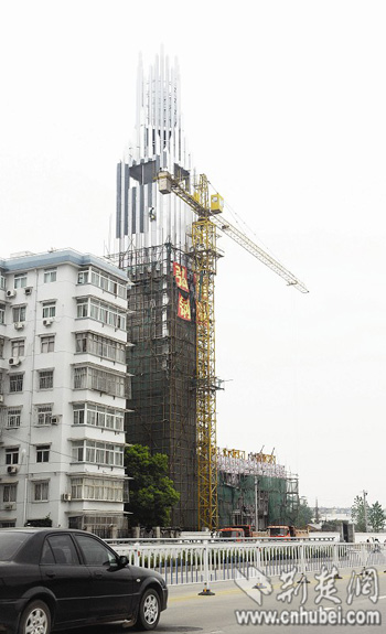 本月底,长江隧道两座通风塔将分别在武昌和汉口出口处建成。两座通风塔主要用于排出隧道内的汽车尾气及各种废气。两塔造型截然不同,汉口为钟楼形状,高42米;武昌为风琴形状,高48米。图为武昌通风塔。(张欣)