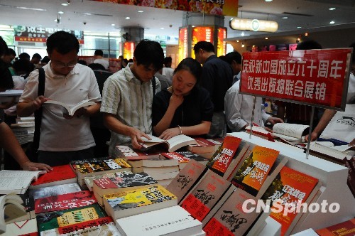 2009年9月13日,读者在北京西单图书大厦选购国庆相关图书。双休日,北京西单图书大厦内的建国60周年图书柜台迎来了大批读者,国庆60周年相关内容图书受到广大读者追捧。中新社发 樊甲山 摄