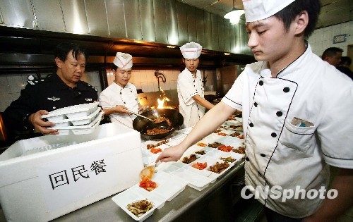 近日,北京西城警方按照营养专家商议拟定的午餐、晚餐食谱是每餐四荤三素七菜、一汤、两种主食、酸奶一盒,香蕉、苹果、西瓜等水果任选一种。这是《北京西城公安分局国庆安保期间勤务餐饮食谱》规定的内容。从国庆演练起,所有参战的警员都能吃上营养可口的国庆勤务餐。中新社发 张岩 摄