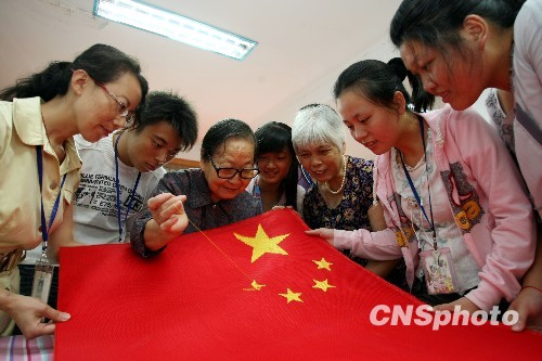 9月15日,无锡市广丰三村社区的居民与职业学校的师生们聚集在一起,开展“绣红旗 迎国庆”活动。在《绣红旗》红色经典乐曲声中,82岁的老党员邵秀英向学生和居民们展示了迎接新中国成立60周年亲手绣制中的一面五星红旗,祝愿祖国的明天更加美好。中新社发 宦玮 摄
