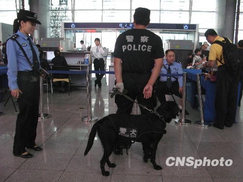 9月16日,北京火车南站旅客入口处,公安安检岗位进入建国六十周年安检规范程序序列,特警人员手牵名贵警犬上岗执勤。中新社发 邹宪 摄