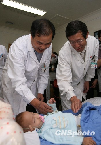 9月17日下午,河南郑州做完畸胎摘除手术的1岁女童顺利度过高危期,河南省人民医院领导到病房看望小梦如,给孩子送去了礼品,表示继续全力救治。9月14日,女童经过5个多小时艰难手术,一个重4.5公斤的畸胎瘤终于被惊险取出,而孩子术前体重仅为10公斤。中新社发 向明超 摄
