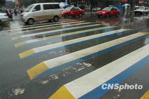 近日,河南周口市一种由蓝、白、黄三种颜色组成的彩色立体斑马线亮相,这种斑马线给人一种空间感和视觉冲击,有利于刺激司机的视觉,提高行车安全率。中新社发 杨正华 摄