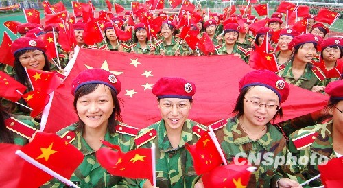 9月18日,江苏省扬州大学广陵学院参加军训的“90后”新生以拼建国60周年图案、办“红色运动会”、唱红色歌曲、看《建国大业》等方式迎接新中国60周年华诞。中新社发 扬州高钱 摄
