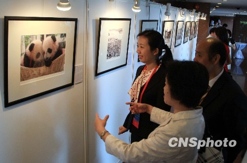 9月19日上午,“迎世博摄影展”在上海举行的“第五届世界华文传媒论坛”会场开幕并展览,精彩趣味的摄影作品,吸引与会代表的视线。中新社发 潘索菲 摄