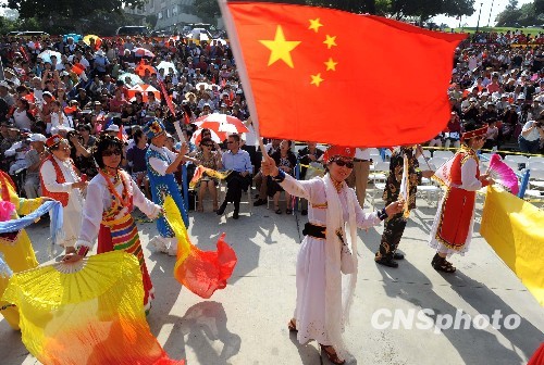 数千名洛杉矶华人华侨九月十九日上午在加州蒙特利公园市集会,为新中国成立六十周年举行规模空前的升旗典礼。中新社发 张炜 摄