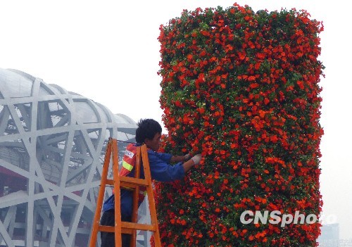 2009年9月19日,北京奥林匹克公园,“鸟巢”与“水立方”之间的两组大型立体花坛和百余根立体花柱正在加紧搭建,将营造出花团锦簇的景象喜迎建国60周年。中新社发 玉龙 摄